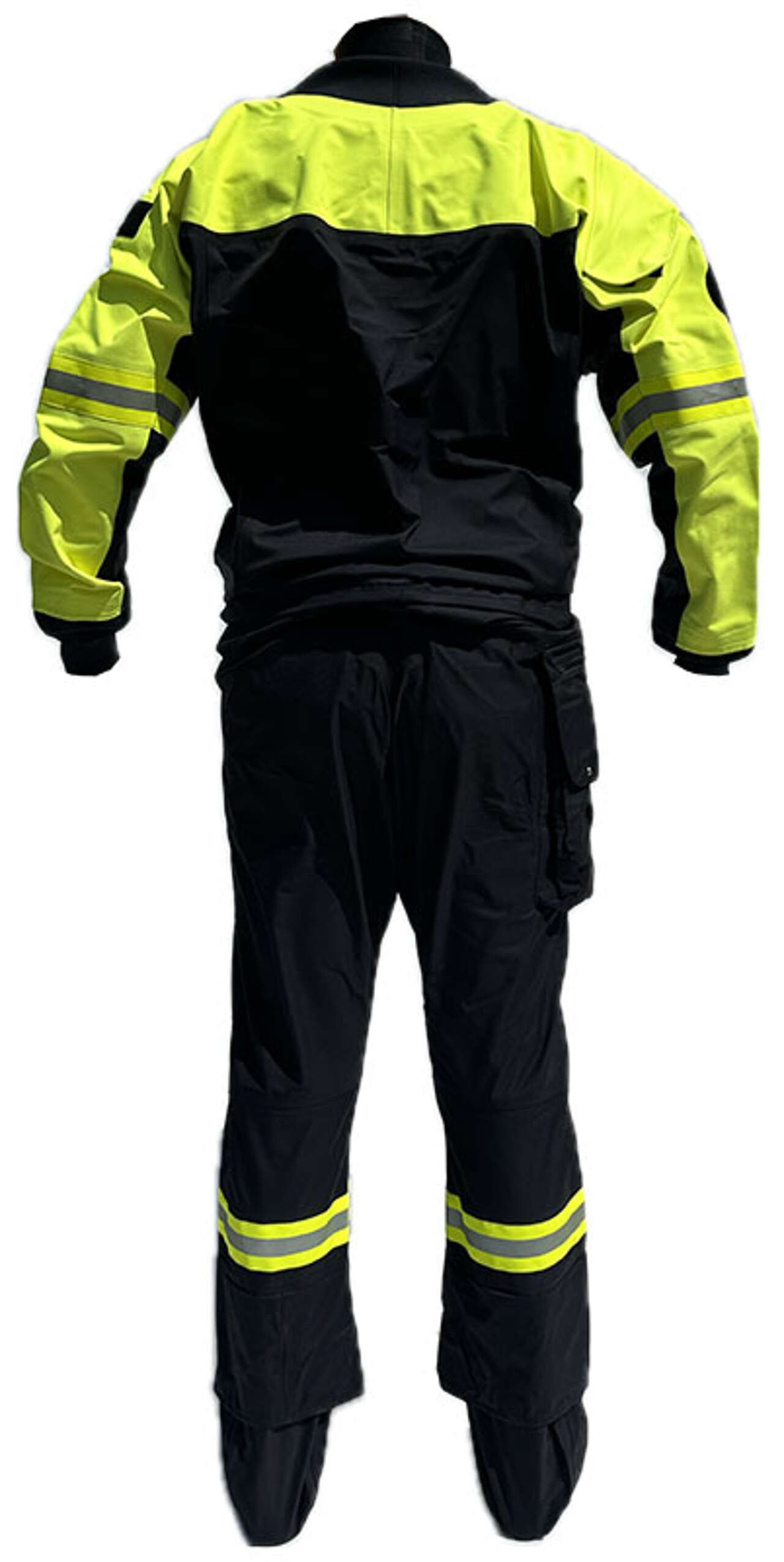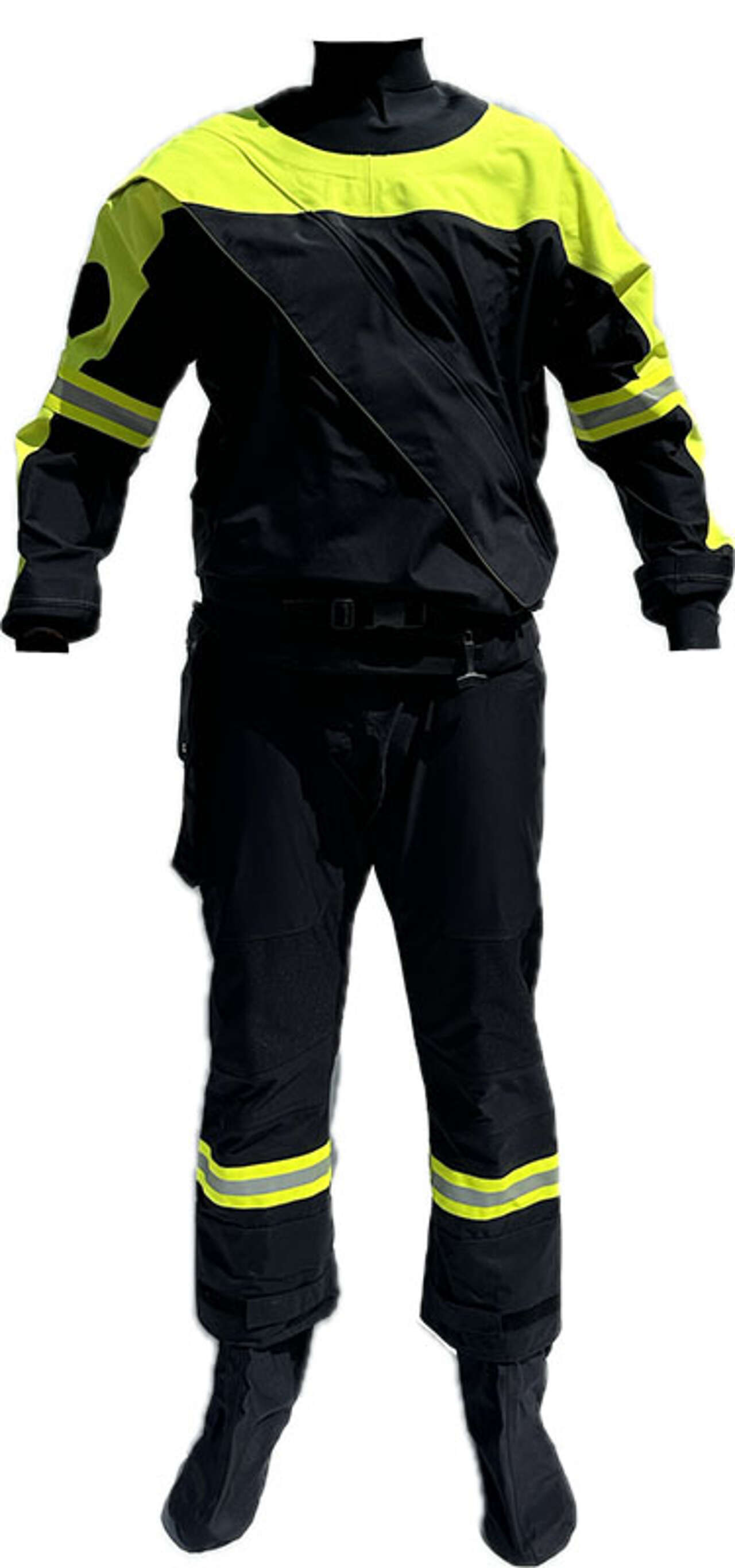 Idrocostume concepito per l'intervento in ambiente acquatico, realizzato in tessuto trilaminato traspirante e certificato come Dispositivo di Protezione Individuale di categoria III.