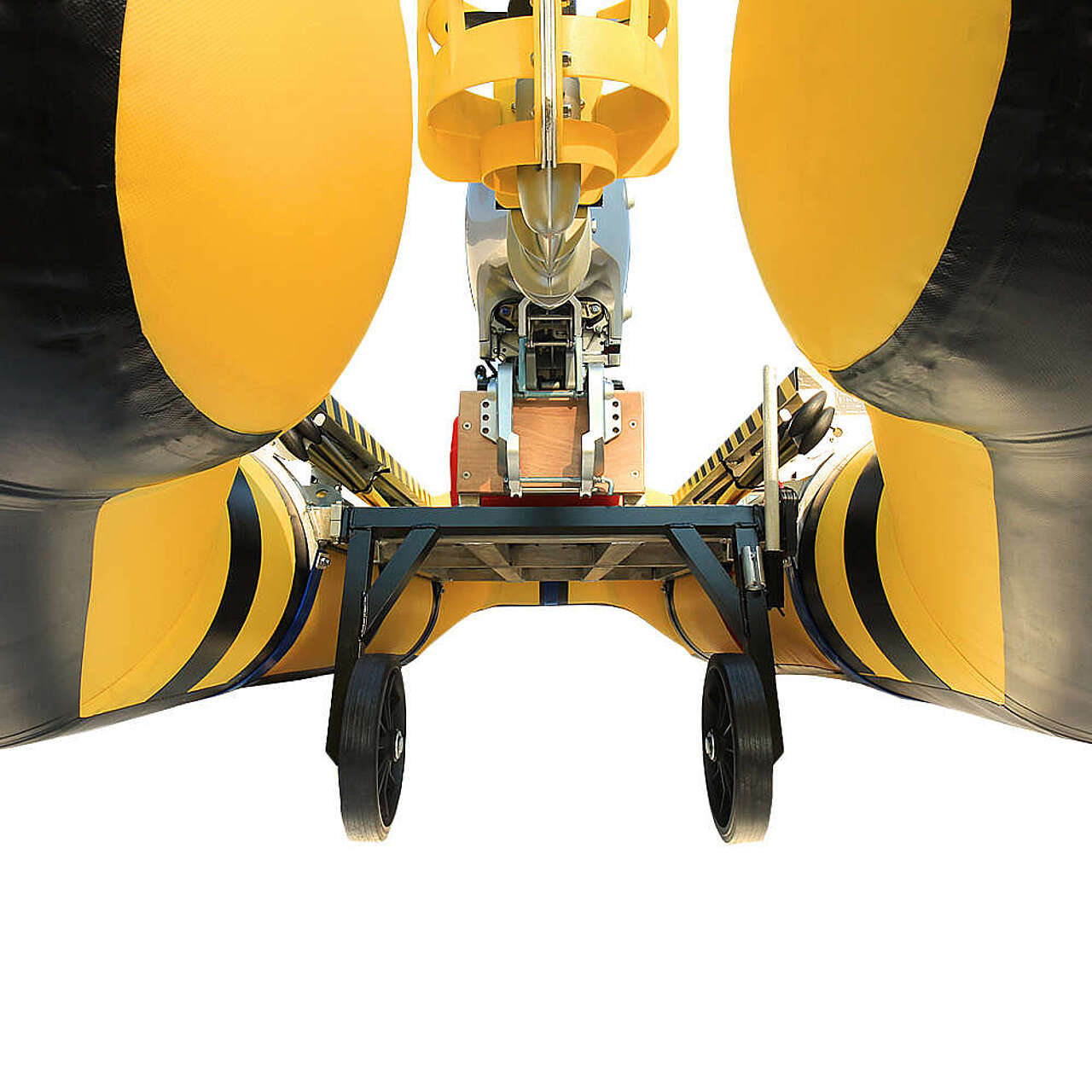 CARATTERISTICHE: Lunghezza cm. 400, larghezza cm. 200, diametro dei tubolari cm. 55, con 4 compartimenti separati e corda perimetrale. Area calpestabile cm. 270 x 100. Sistema di ruote semplificato per permettere lo spostamento in piano con 1 solo operatore, 8 Maniglie, 10 Anelli inox, golfari per il sollevamento bilanciato e specchio di poppa intercambiabile a seconda del motore montato