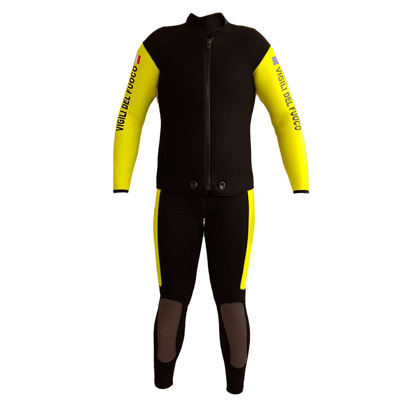 Muta completa in 2 pezzi, realizzata con neoprene da 5 mm con fodera esterna e tessuto felpato interno. Il pantalone e' realizzato con la parte alta in neoprene liscio interno e spessore differenziato a 3/5 mm, cerniere alle caviglie rinforzi in KEVLAR su ginocchio e gamba, pannello posteriore con rinforzo in SUPRATEX.