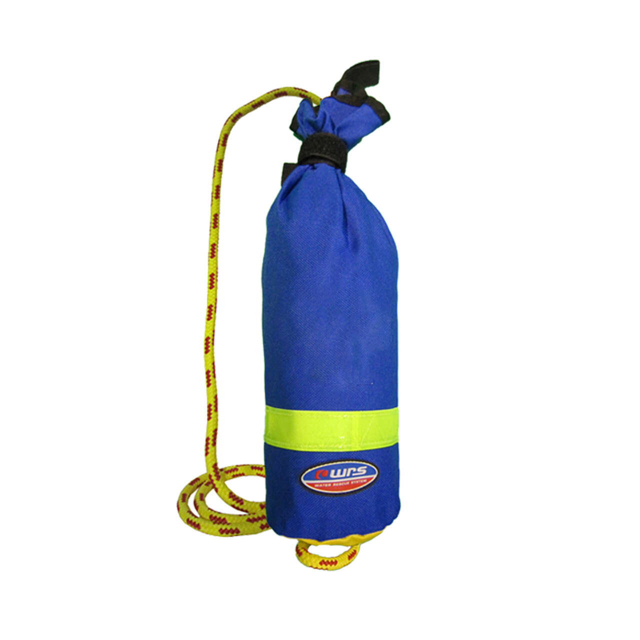 Sacchetto in cordura antistrappo, dotato di banda fluorescente, forma con bocca allargata, rapida apertura e chiusura con fettuccia di velcro. Corda statica galleggiante gialla intrecciata con spia rossa.