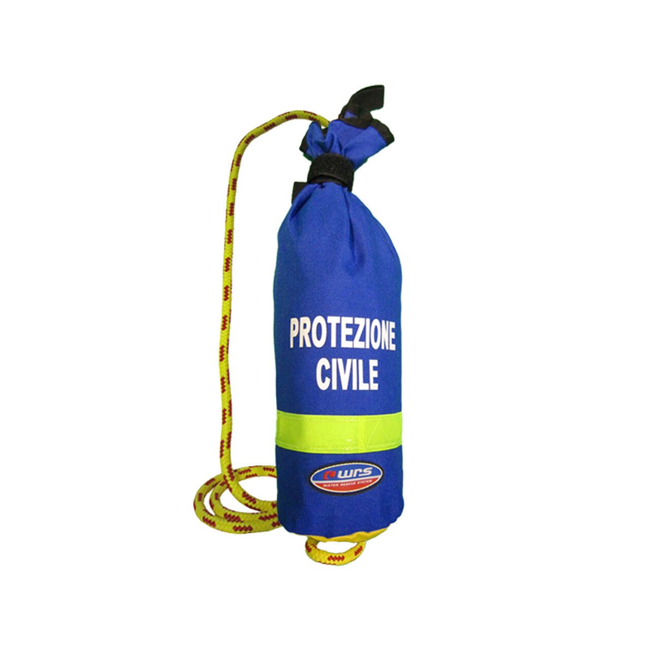 Sacchetto in cordura antistrappo, dotato di banda fluorescente, forma con bocca allargata, rapida apertura e chiusura con fettuccia di velcro. Corda statica galleggiante gialla intrecciata con spia rossa.