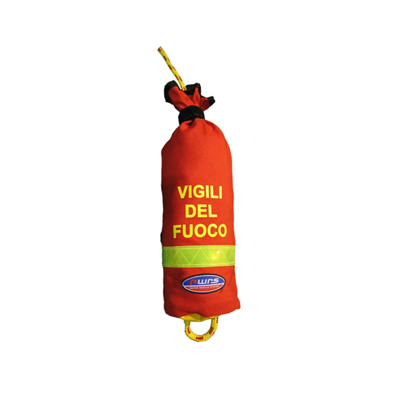 Sacchetto in cordura antistrappo, dotato di banda fluorescente, forma con bocca allargata, rapida apertura e chiusura con fettuccia di velcro. Corda statica galleggiante gialla intrecciata con spia rossa.